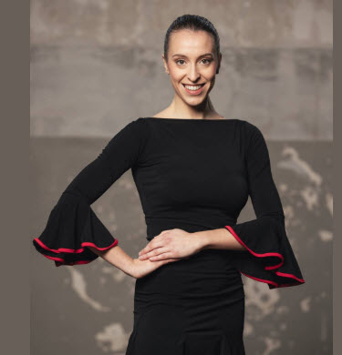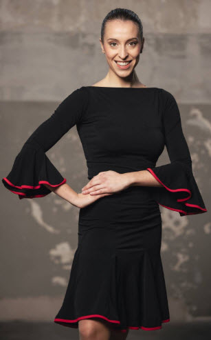 Camiseta Top para Baile de Salón o Baile Latino con manga 3/4 y volante ribeteado en contraste, escote barco en delantero y más escotado en espalda