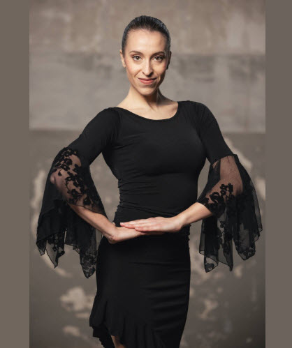 Camiseta Top para Baile de Salón o Baile Latino con volantes de tul elástico estampado en manga y aplicación de tul elástico en la espalda