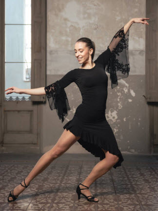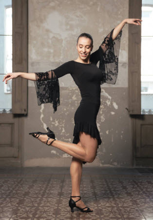 Confeccionada en punto elástico para una total movilidad y confort en tus pasos de baile latino, salón, salsa, tango, rumba, cha-cha-cha, mambo, bachata…