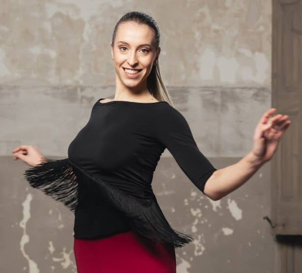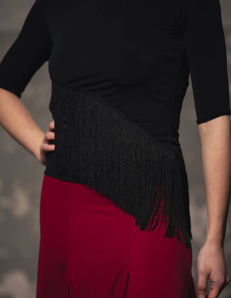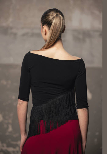 Camiseta Top para Baile de Salón o Baile Latino con manga 3/4 y escote barco con fleco elástico de 20cm