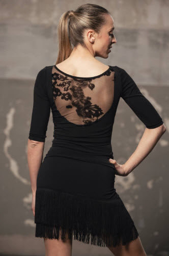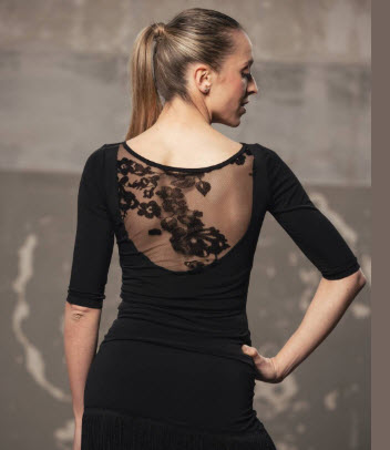 Camiseta Top para Baile de Salón o Baile Latino de manga 3/4 con aplicación de tul elástico estampado en la espalda