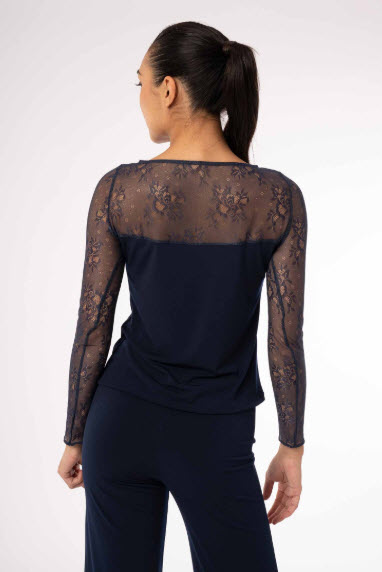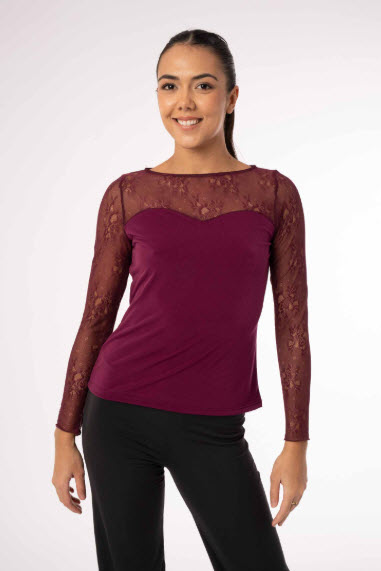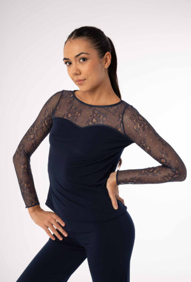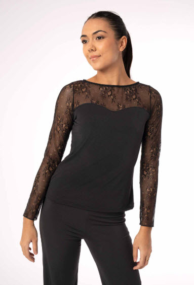 Camiseta Top para Baile de Salón o Baile Latino de manga larga con blonda floral en escote, espalda y mangas
