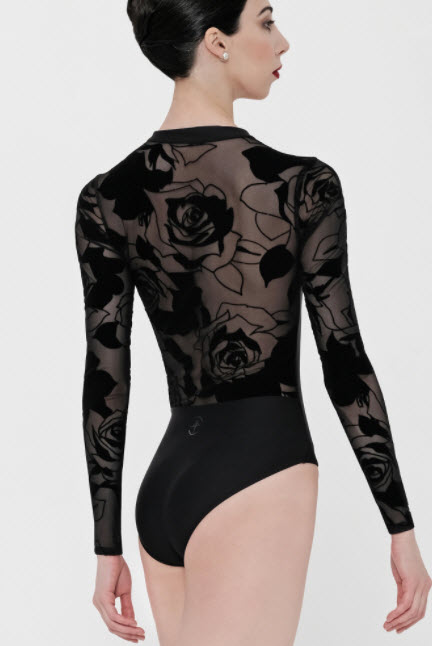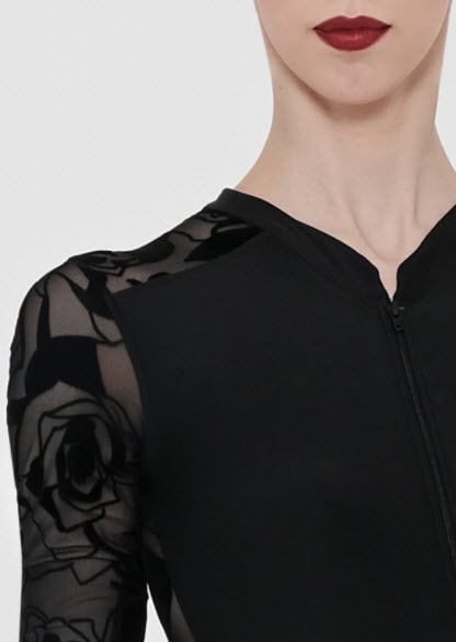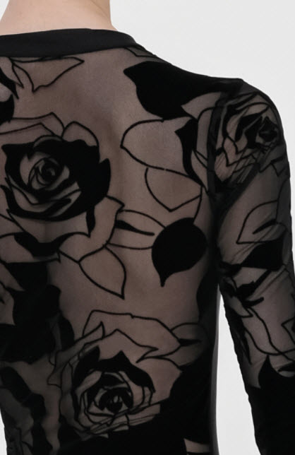La espalda, mangas y hombros transparentes revelan la piel y contornean el cuerpo con grandes flores, como un tatuaje
