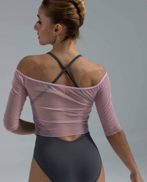 Precioso top en microtul elástico, corto hasta cintura con hombros caídos, manga hasta codo, bajos pulidos y escote con elástico