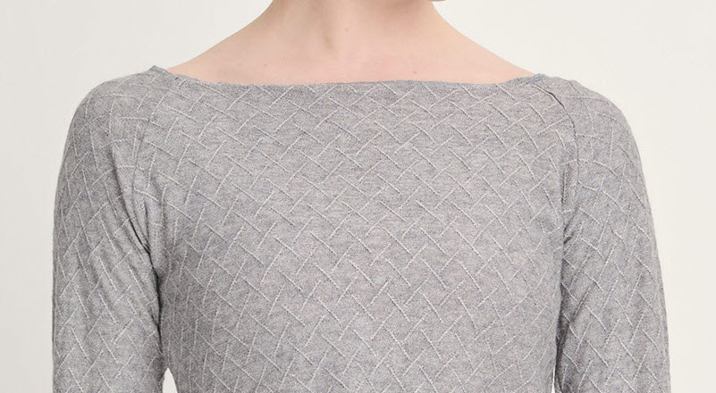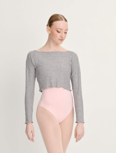 Top corto de manga larga raglán y cuello barco en tejido de punto suave, con estructura y detalle metalizado