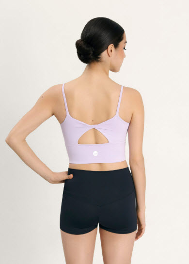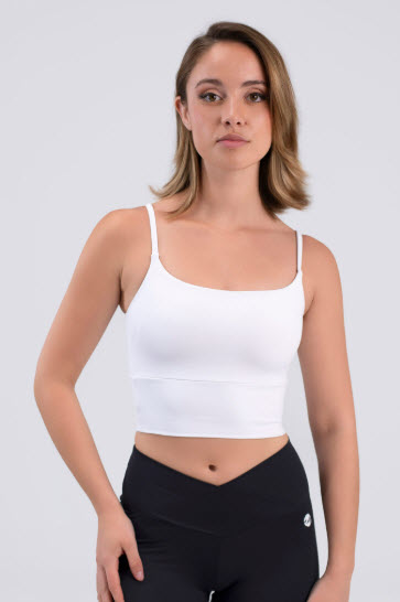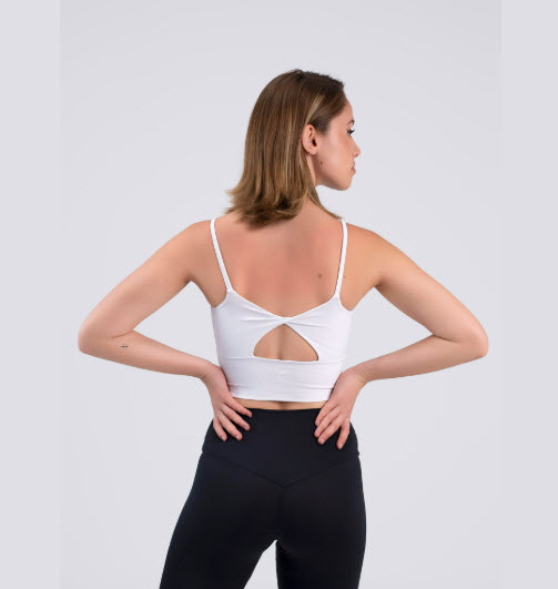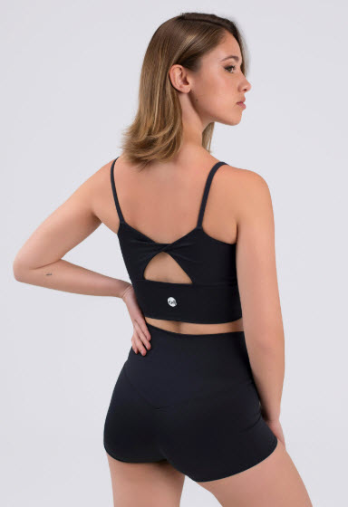 Top corto de tirantes con cinturilla ancha y escote circular, espalda con detalle cruzado, copas extraíbles en tallas adultas y logo blanco