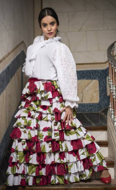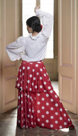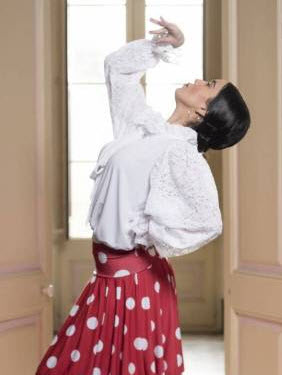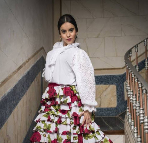 Top flamenco hasta 1/2 cadera fruncido en la cintura, manga campesina fruncida en sisa y en muñeca (terminado en elástico), detalle de la manga en blonda, cuello con doble capa de volantes y lazada catalana en la parte delantera