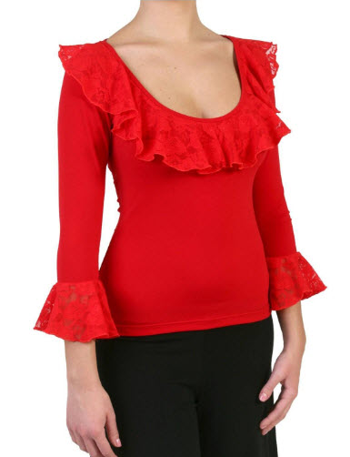Top flamenco confeccionado en punto elástico, manga tres cuartos, volantes en blonda de encaje en mangas y escote