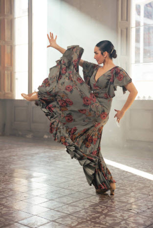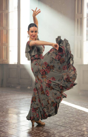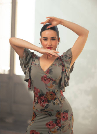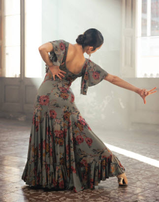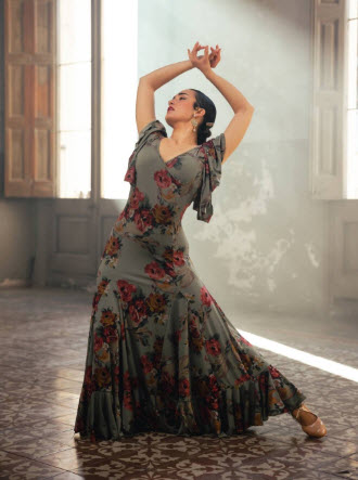Vestido Flamenco estampado largo con escote delantero cruzado, mangas montadas acampanadas, godets en los laterales y costadillos, volantes en todo el contorno del bajo