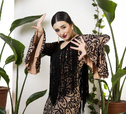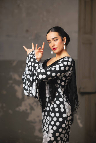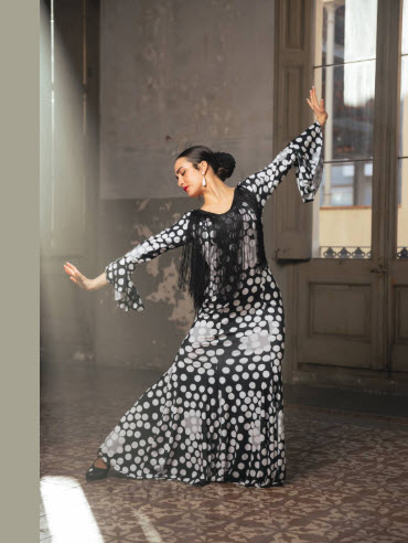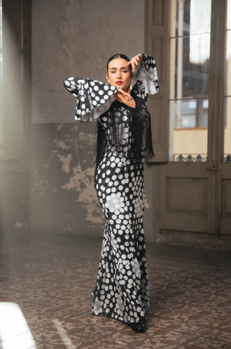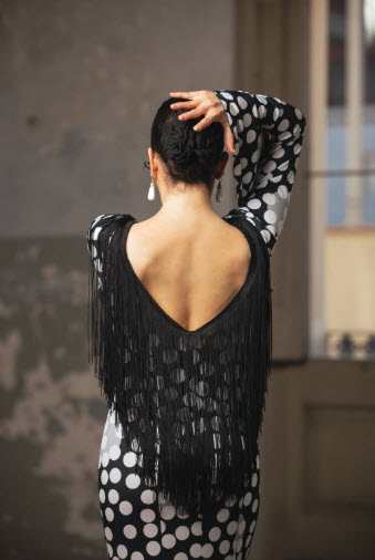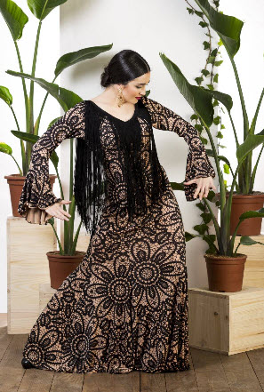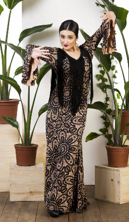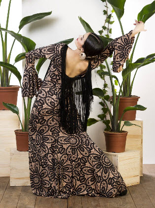 Vestido flamenco con estampado bordado de flores, flecos de 40 cm en espalda y escote, volante grande en manga
