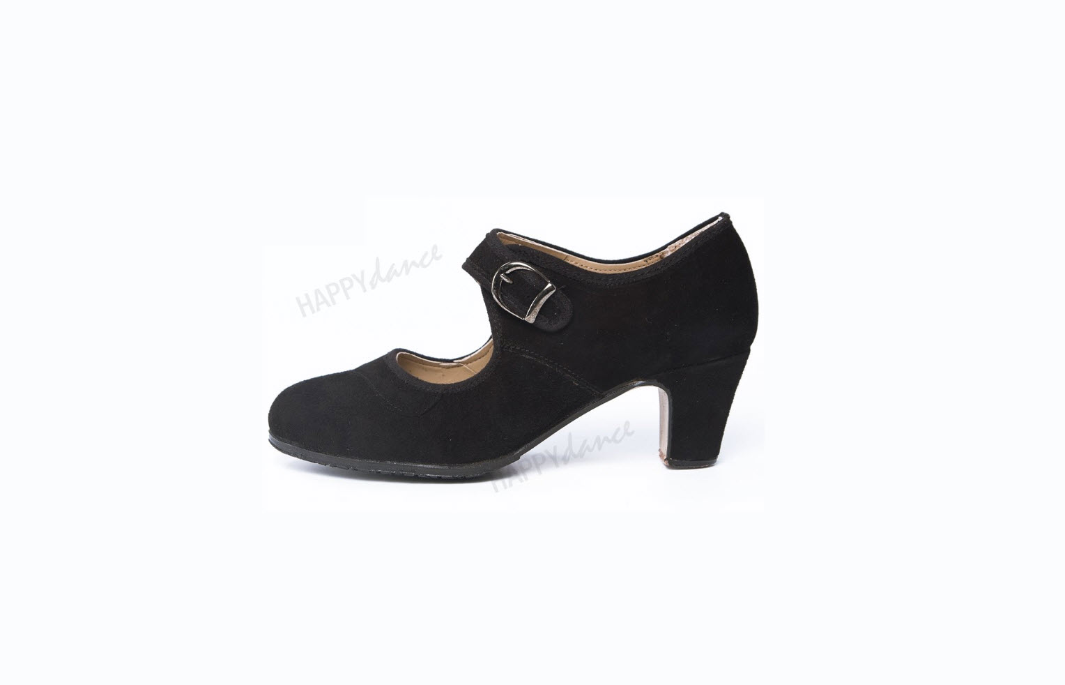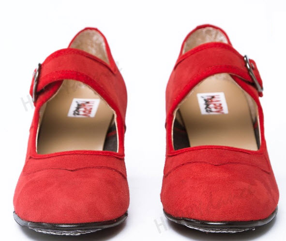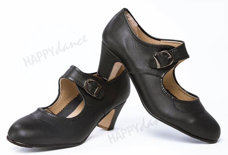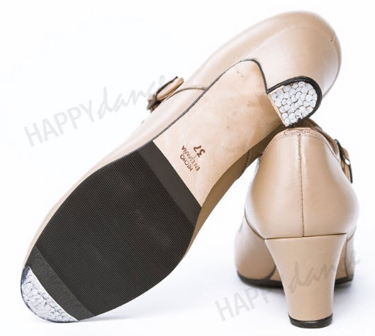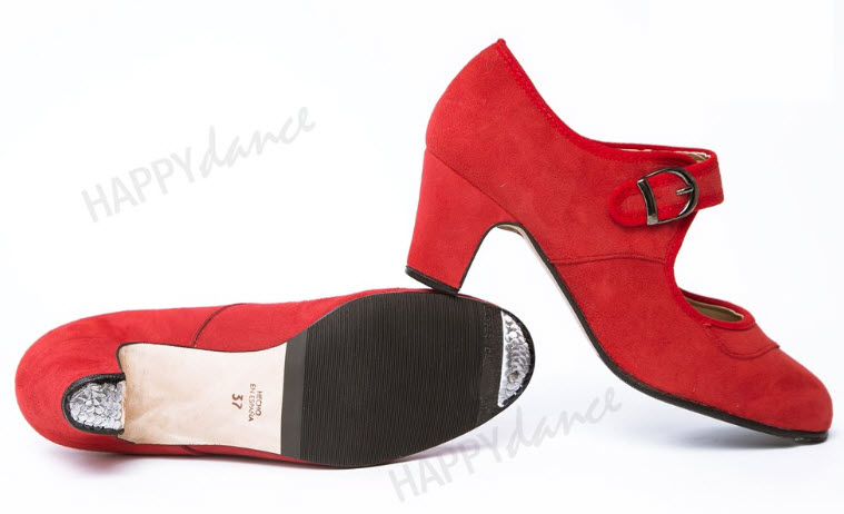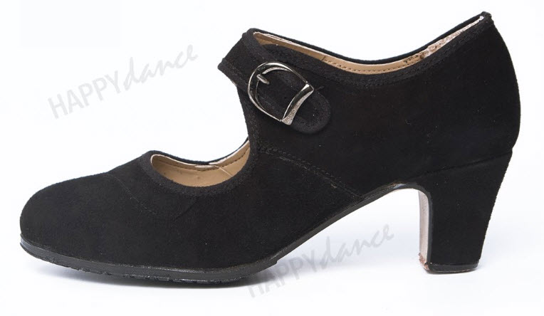 Zapato de flamenco amateur en piel o ante, hebilla ancha, antifaz con pico, clavos, medio forro, suela antideslizante, tacón de 5 cm