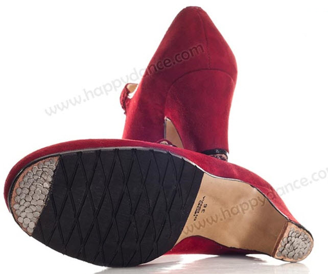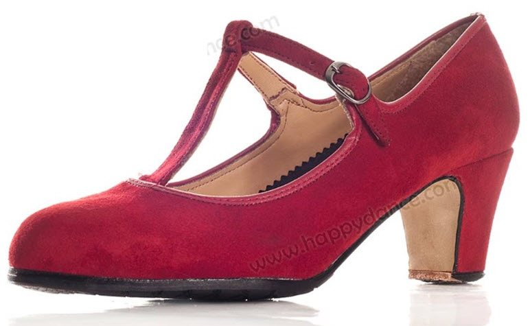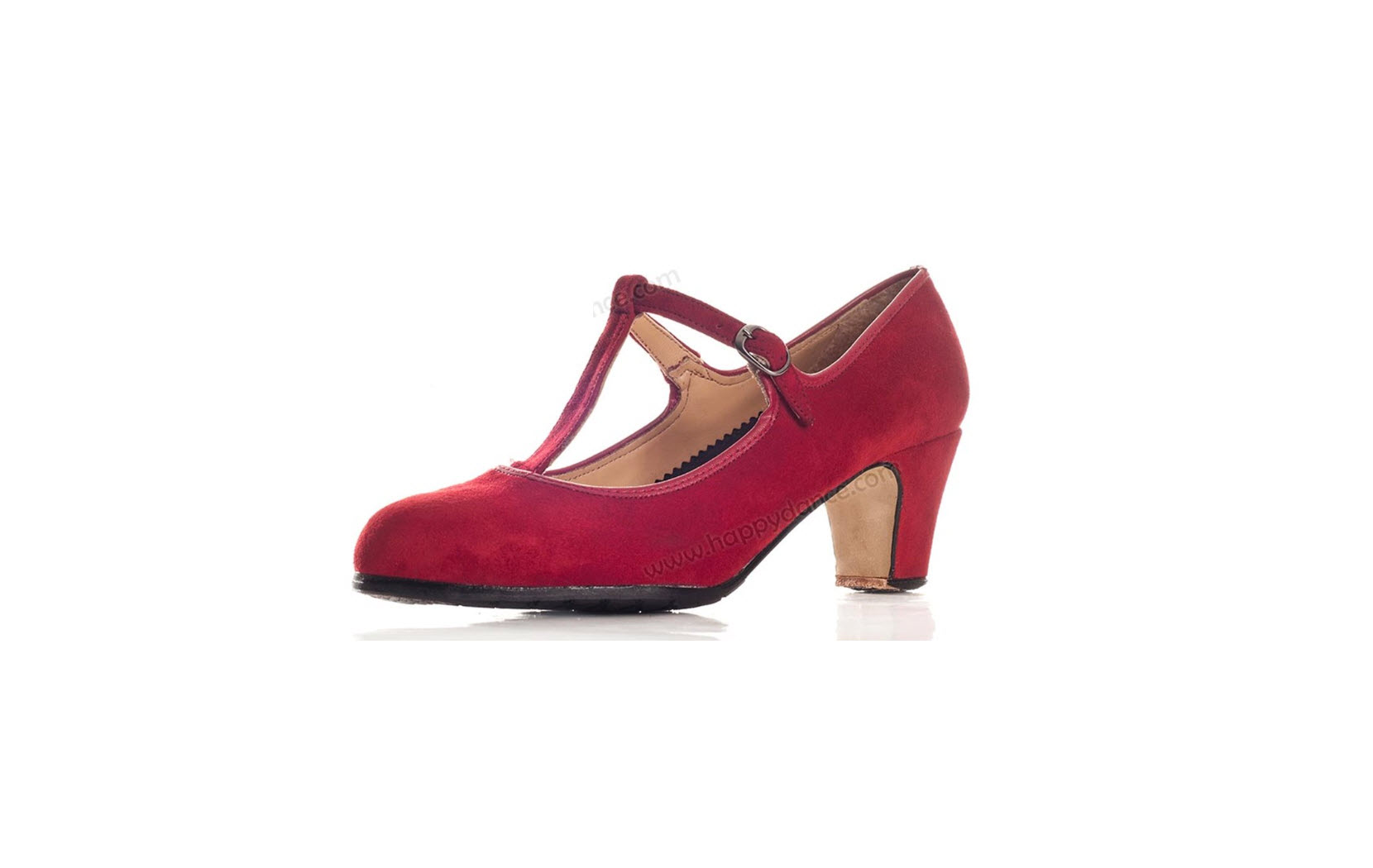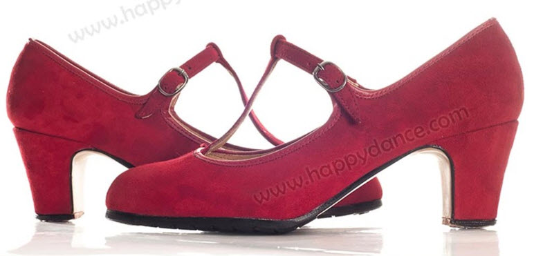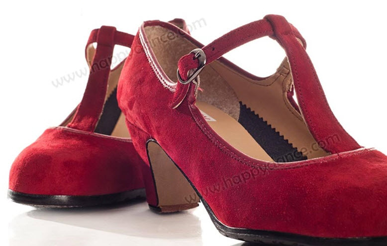 Zapato de flamenco semiprofesional en piel o ante, tira en forma de T, hebilla, clavos, medio forro, doble suela antideslizante, tacón de 5 cm